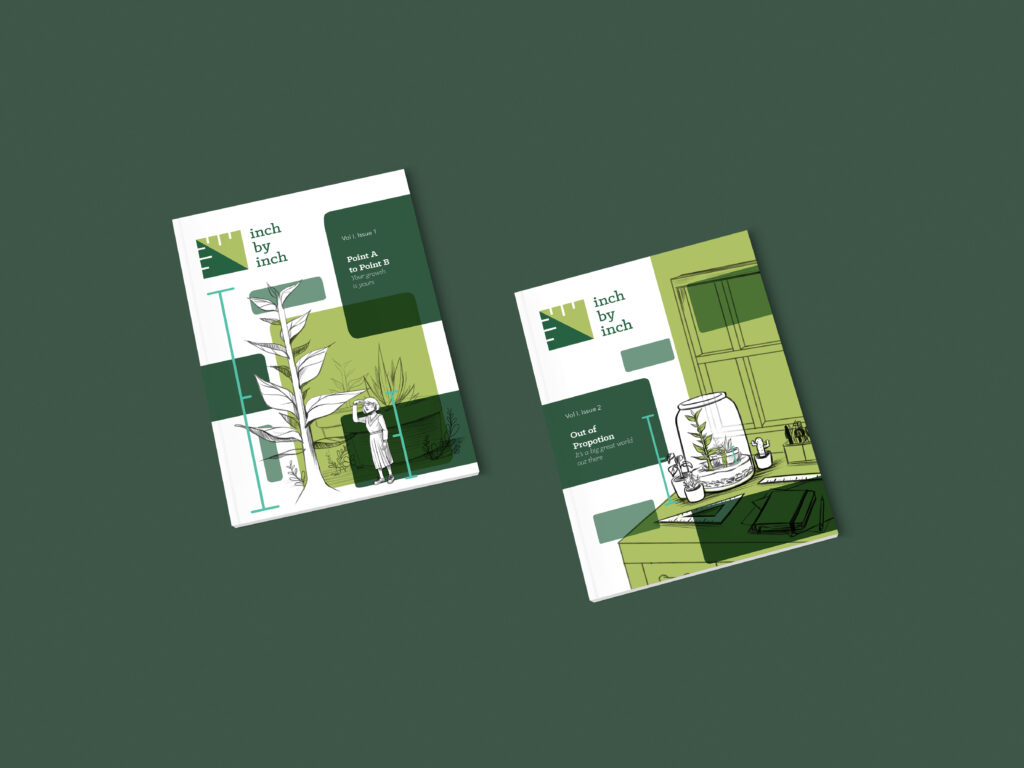 (Left) The logo is a combination of a leaf and an inch block. The metric look was also applied to the icons for the zine’s different sections (top)